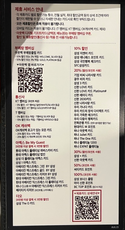 사진에 보시면 통신사와 제휴 이벤트 카드의 할인률이 나와 있습니다.